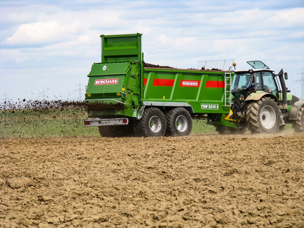 Univerzální rozmetadlo Bergmann TSW 5210S. Pneu BKT 600/55-26,5, K80, nástavce bočnic 450 mm, hydraulické stavěcí hradítko s výškovým ukazatelem, 2-válcové rozmet. ústrojí s pohonem kardany, celková přípustná hmotnost 21 t, 40 km/h, doporučený výkon traktoru 140 - 250 jP. Předváděcí stroj, možno vyzkoušet.